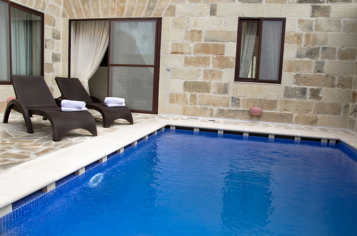 Escápate al tranquilo entorno de Gozo en nuestra casa de vacaciones premium de 3 plantas con inmejorables vistas al mar Mediterráneo y puestas de sol sobre un auténtico pueblo gozitano. Los huéspedes disfrutan del uso privado de la increíble terraza en la azotea con una piscina de borde de vidrio y barbacoa/comedor al aire libre. El interior de diseño está equipado con cocina completa, TV inteligente 4K, aire acondicionado en todas las habitaciones y wifi. La tranquila ubicación está a solo 5 minutos a pie de la bahía de San Blas y a 7 minutos en coche de la arena de la bahía Ramla.