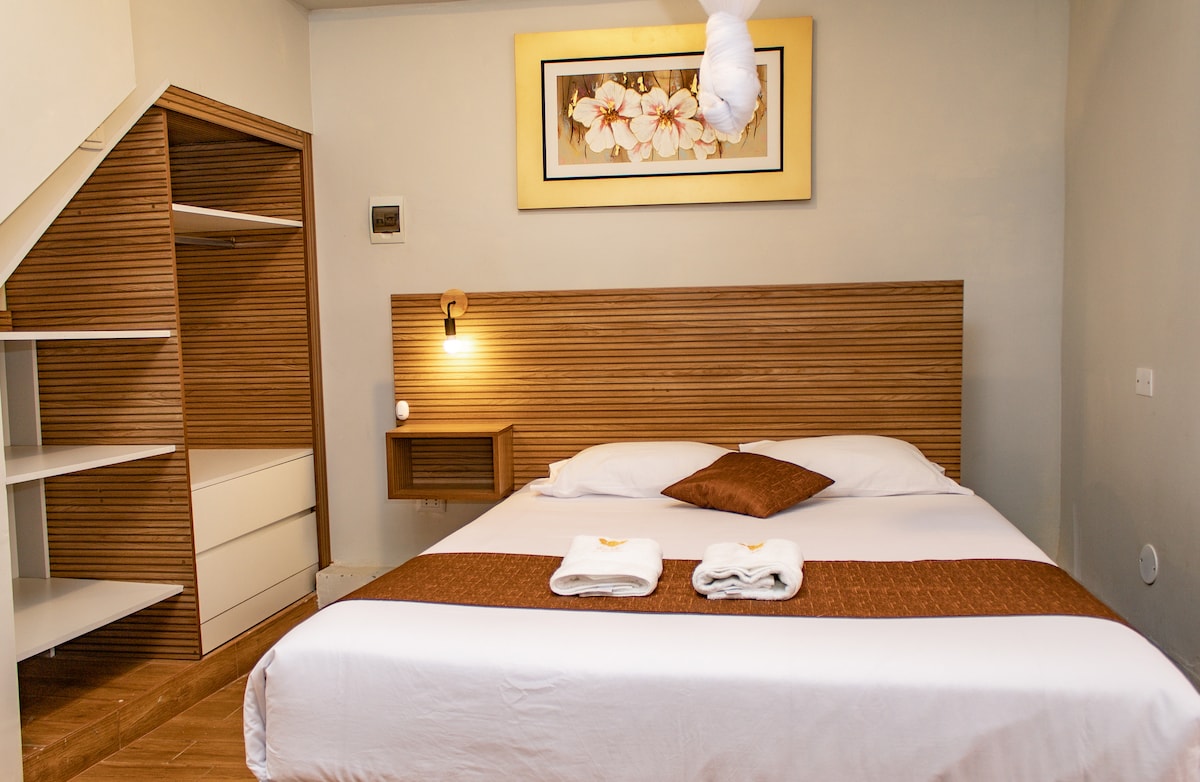 Departamento cómodo y funcional, ideal para viajes cortos o largos. Cuenta con piso de porcelanato, ambiente bien iluminado, cama confortable, mesa y sillas, y TV para tu descanso. La cocina está equipada con refrigeradora, cocina a gas, lavadero y utensilios básicos. Incluye garaje para mayor seguridad y un patio interno que aporta ventilación y tranquilidad. Espacio limpio, práctico y bien distribuido para una estadía agradable.