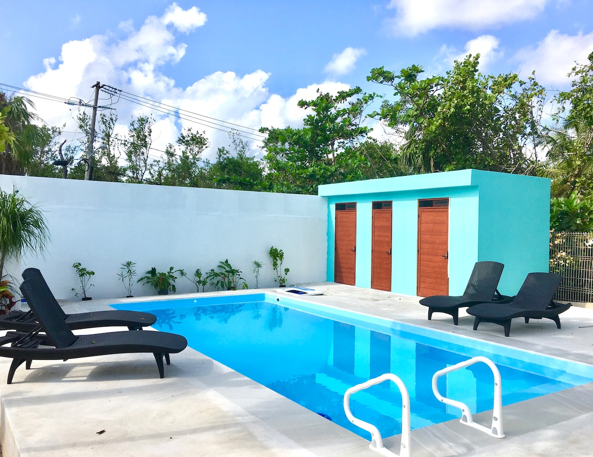 Come and enjoy a quiet and a nice place, with pool, terrace, lounge chairs and hammock. In the kitchen utensils to cook. In the bathroom we put towels, shampoo, body wash 🧴 It is close to Chedraui, you can walk there 5-8 minutes. Is one block from the Main Street Juarez Avenue, were you can take a taxi or a van. In Juarez avenue are few small restaurants, laundry, groceries store Oxxo. It is 3 blocks from hiway where you can take the vans to Tulum or Cancún. 20 minutos walking to the beach.