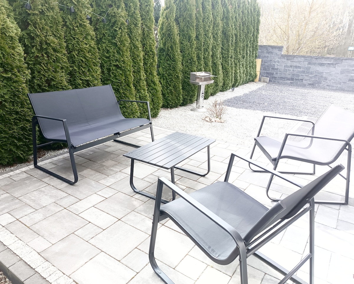 Inani: un oasis forestal en el corazón de Poznań. Bienvenido a una cabaña única de 30 metros cuadrados en Poznań, a 15 minutos del centro de la ciudad y de la Feria Internacional de Poznań. La propiedad está diseñada por un arquitecto, con una gran ventana de madera, chimenea, ventilador, cocina totalmente equipada y baño. En el jardín de 700 m²: terraza, chimenea, hamaca, árboles altos y pájaros cantando. Cama escondida en el armario, lavadora, mesa, armarios. Parada de autobús a 1 minuto de la casa. La combinación perfecta de proximidad a la ciudad y a la naturaleza: silencio, estilo y comodidad.
