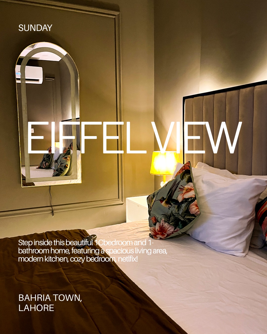 Luxury 1-Bed Apartment | Eiffel View | Staysia Rooms 1 - Eiffel View Balcony for morning coffee 2 - Queen Bed with Floating Lights 3 - 2 Smart LCDs (55” in bedroom) + Netflix 4 - 2 ACs (1 free, 1 optional +PKR 2000) 5 - High-Speed Wi-Fi, peaceful ambiance 6 - Dining for 4, plates & cutlery 7 - Self Check-in/out + Welcome Basket 8 - No parties, drugs, alcohol, or loud music 9 - Stylish décor & professional hospitality 10- Comfortable, cozy and Spacious