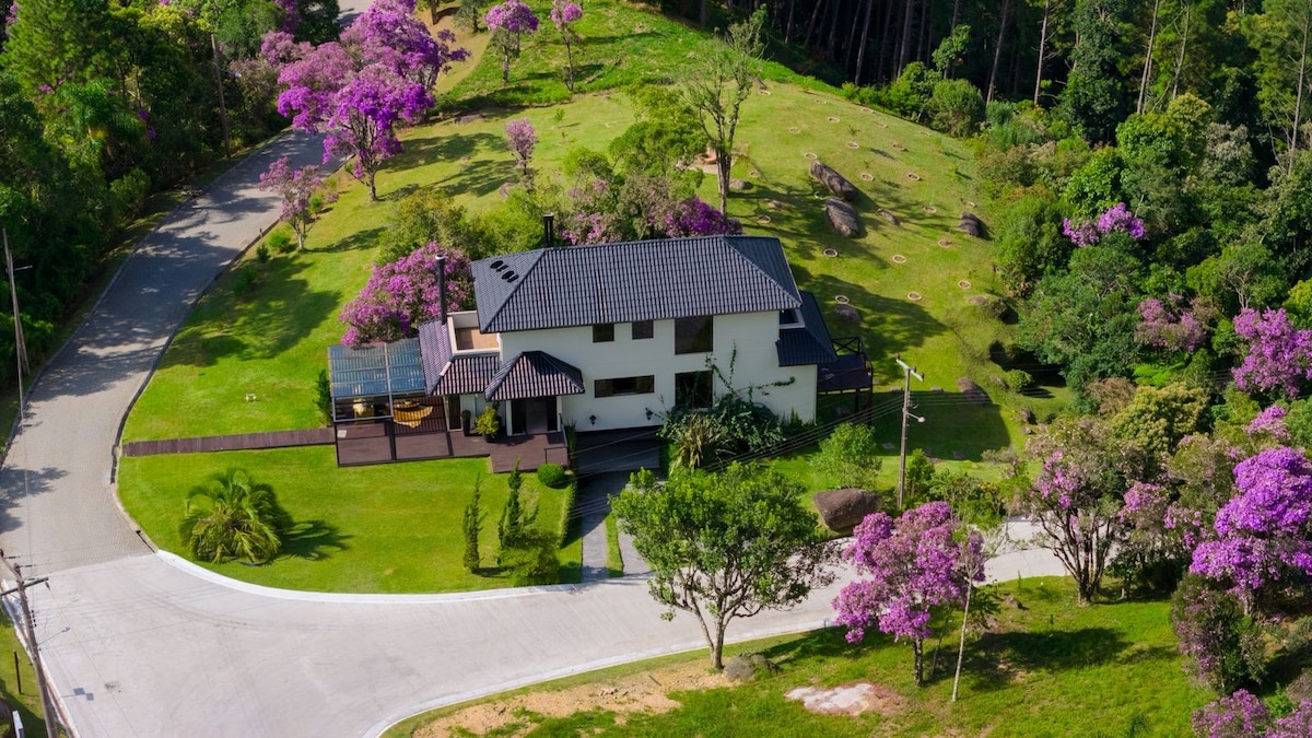 Divirta-se e relaxe com amigos e toda a família nesta linda casa de campo. Casa ampla (430m²) com grande sala conjugada de 100m² e totalmente equipada. Três amplas suítes, sendo a principal com banheira. Capacidade de 4 pessoas por suite. Varanda ampla com jacuzzi aquecida. Sala de Jogos. Vista e por do sol deslumbrantes. Condomínio rural próximo ao centro de Rancho Queimado permitindo passeios e compras com facilidade. Se possível, somos bem flexíveis com os horários do check in e check out.