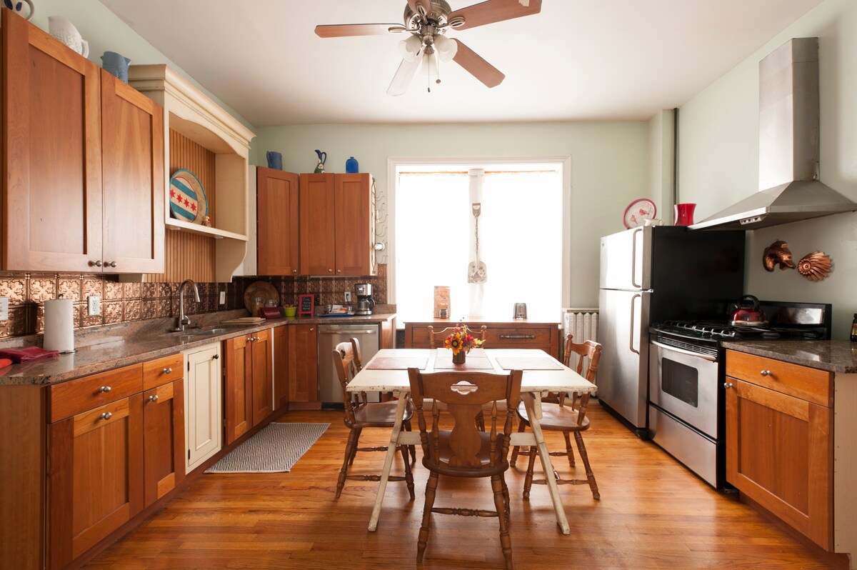 Charming home in an updated 1800's beautiful brick building. High ceilings, spacious, loads of windows and antique furnishings. Located in the heart of Chicago's Lincoln Square. 2 blocks to the El train. Walk to movies, restaurants, bars, parks. Lovely quiet & upscale neighborhood. Bike to the beach & downtown. 2 blocks from Old Town School of Folk Music. Inquire about our Cubs Season Tickets! Space is ideal for adults and families with children over 10 yrs.