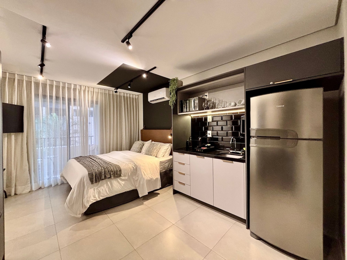 Studio 40011: 4 min do Allianz Parque. Estúdio compacto, moderno e completo e confortável em uma das regiões mais culturais de SP. 📍 Cercado por cafés, restaurantes e shows. Aqui a cidade pulsa ✨ Cama aconchegante, bancada, armário, ar-condicionado, TV, e cozinha equipada com sanduicheira, air fryer, cafeteira, fogão, geladeira. 🚿 Banheiro privativo e iluminação acolhedora. com aquele clima de "quero ficar mais um pouco" Perfeito para curtir, descansar ou trabalhar. Reserve agora!