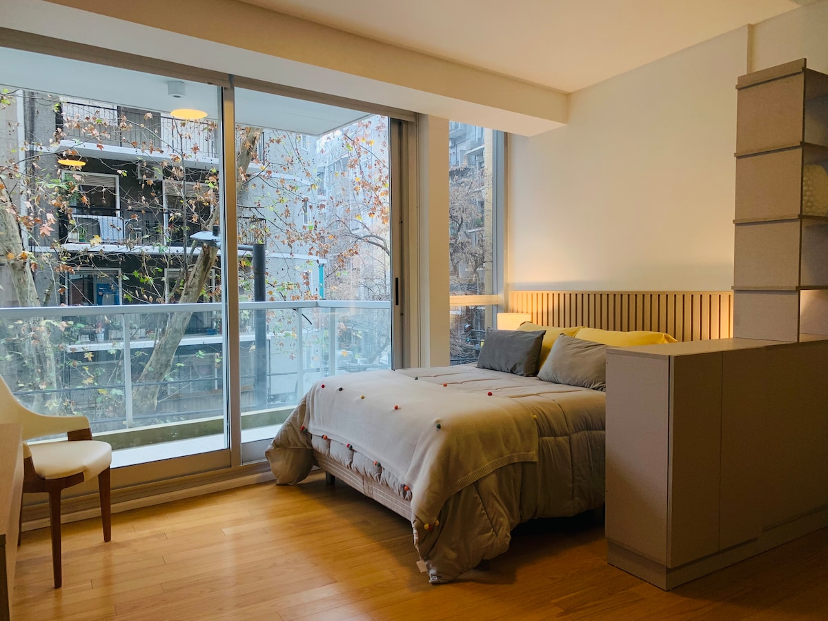 Studio a estrenar con kitchenette, baño y balcón con excelente vista en el corazón de Recoleta. Decoración moderna, totalmente equipado y seguro. SmartTV con cable y Netflix (accedé con tu cuenta). Edificio con excelentes instalaciones: piscina interior climatizada, piscina exterior con solárium, spa con sala de masajes y sauna, y gimnasio. A poca distancia de los mejores restaurantes, bares y cafeterías, así como de la estación de bús y metro.