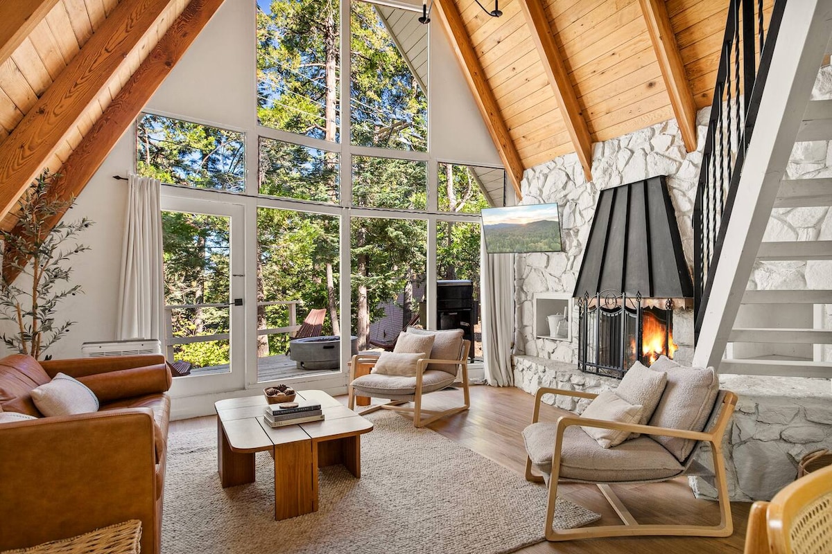 This Black A-Frame style cabin nestled in the trees of Running Springs. Surrounded by grand pine and cedar trees, it makes you feel like you are exploring tree tops. This cabin has decks on each of its 3 levels to appreciate it even more. You are greeted with a mid-century modern styling throughout the home that take you back to a golden era of design. Enjoy snuggling in the A-frame loft, get lost in a good book, enjoy some classic music, or enjoy a film in the secret cinema room...