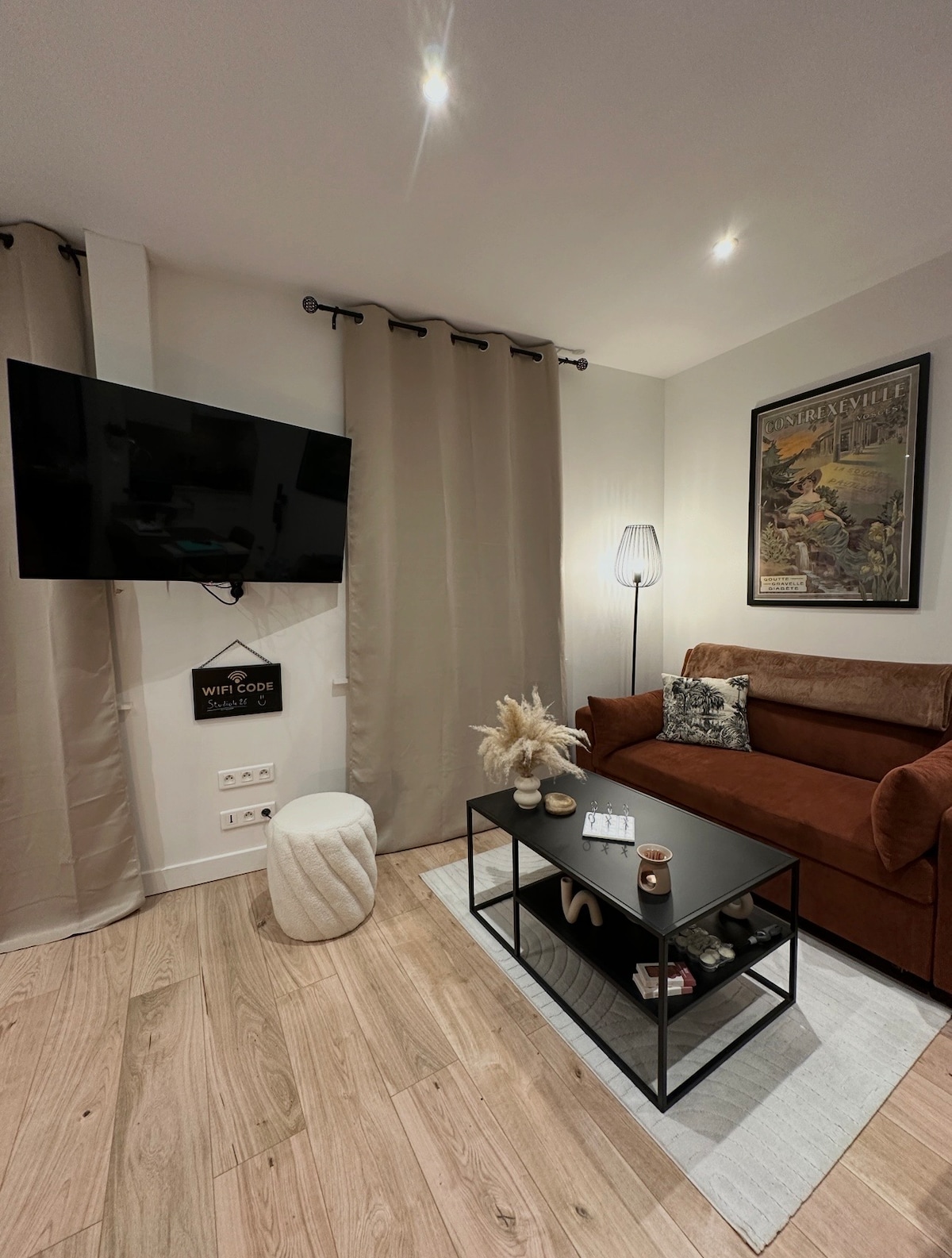 Appartement moderne de 55m2, à 5min à pied du centre ville,tv et WIFI, Quartier calme Parking devant l'appartement Logement : entrée, salle de douche avec WC et machine à laver, 1 pièce avec cuisine toute équipée (cafetière Dolce Gusto) et salon (clic clac) et 1 chambre (avec 1 lit double) Possibilité d'accueillir 4 pers. Possibilité de fournir sur demande de petits électroménagers (appareil à croque monsieur, etc) et/ou lit parapluie. LOGEMENT NON FUMEUR,animaux acceptés. Ménage compris T°20