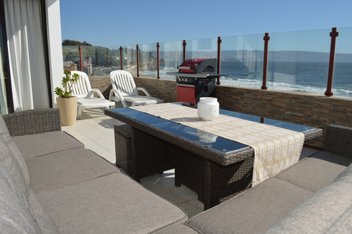 El apartamento dúplex está situado justo enfrente de la playa de Reñaca, entre el sector 3 y 4, con vistas de 180 grados a la playa y a Valparaíso y sus alrededores. El apartamento dúplex cuenta con grandes espacios abiertos con mucha luz. Totalmente amueblado y listo para ser disfrutado. El apartamento dúplex incluye TV de pantalla plana de 65 pulgadas, internet wifi de fibra óptica, cocina totalmente equipada y zona de barbacoa. También hay aparcamiento privado para 2 coches.