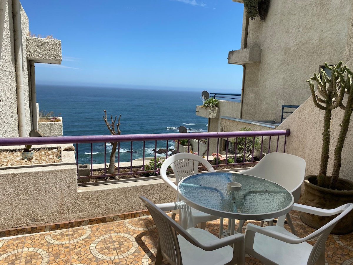 Lindo departamento con preciosa decoración. Totalmente equipado para 4 personas . Primerísima línea, vista libre, espectacular e inmejorable a Valparaíso, se encuentra a 15 min caminando de la playa Cochoa (hay que bajar una escalera). Está a pasos de Supermercado Lider y Jumbo. Incluye 1 Estacionamiento privado subterráneo. Excelente conectividad y transporte público a una cuadra. DEPTO SOLO PUBLICADO EN AIRBNB No redes sociales ni otras plataformas.