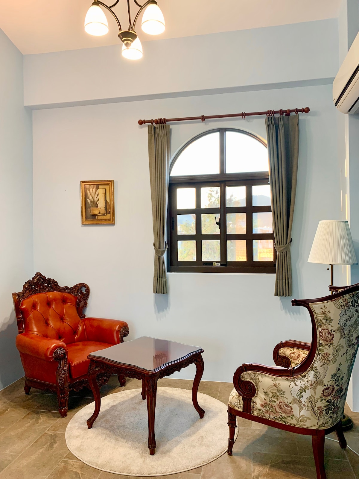 一樓的客廳,搭配優雅大方的實木雕刻沙發,適合旅人閱讀、發呆、滑手機(?)。客房都位於二樓,各有一張雙人床;適合2+2或是2+1的旅人入住。