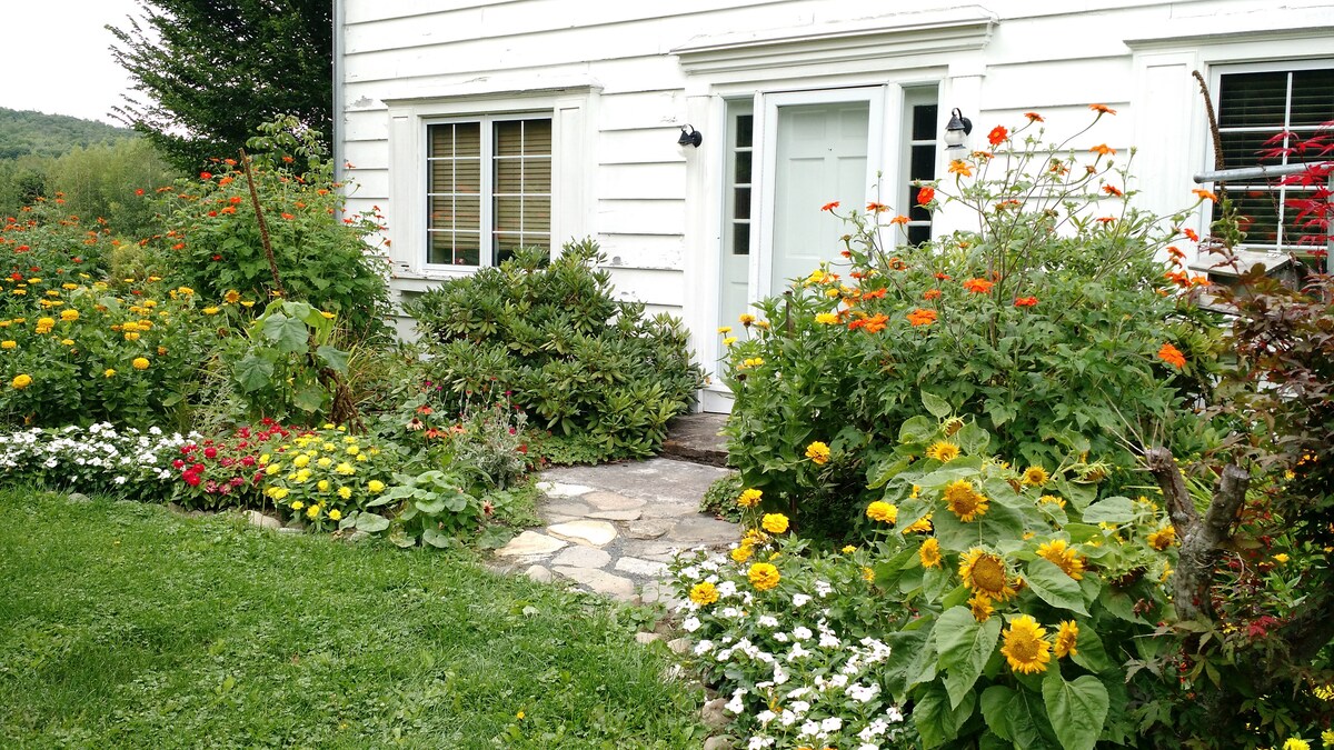 The Writer 's Cottage es una pequeña casa blanca en una carretera rural; vintage, completa e inspiradora. Construido en el siglo XIX, es perfecto para un viajero solitario o un par de viajeros que exploran los Berkshires y el Valle del Hudson. Si te gustan los edificios rústicos, te encantará la cabaña; es una deformación del tiempo increíblemente acogedora. Cama queen y dormitorios en la planta baja; espacioso loft por un estrecho conjunto de escaleras cerradas. Hay un huerto y un césped con parrilla, hamaca y mesa de hierro.