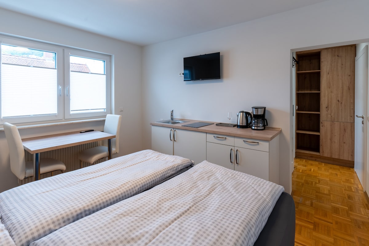Disfruta de la combinación perfecta de naturaleza y vida urbana en nuestro elegante dúplex. Situado justo al borde del bosque, es ideal para pasear o correr, y está a solo unos minutos a pie del centro de la ciudad (15 minutos). La moderna casa de huéspedes ofrece una sala de estar abierta con una pequeña cocina americana y una acogedora zona de estar. El dormitorio en el altillo crea una sensación de amplitud. Hay disponibles opciones de fitness como yoga o una cinta de correr, así como un aparcamiento privado.
