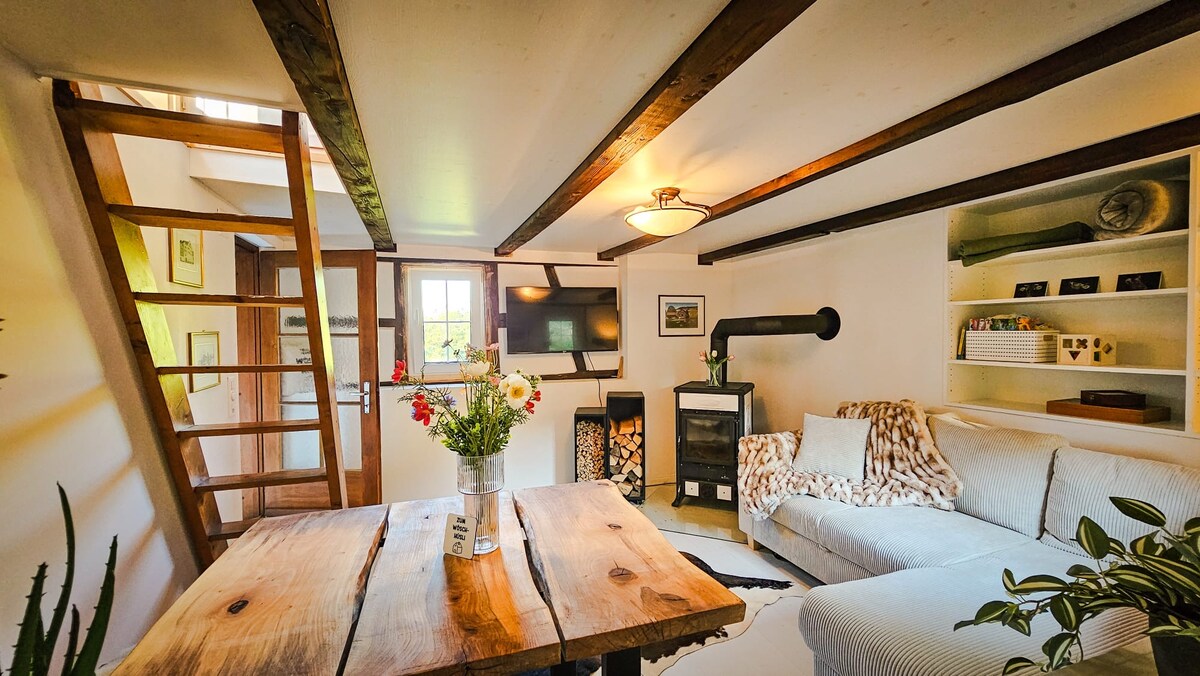 El interior de la Tiny House es moderno, elegante y especialmente diseñado por mí con mucha atención al detalle. Cuenta con una cocina bien equipada con horno, 4 hornillas de gas, fregadero, lavavajillas, cafetera Senseo, tostadora, hervidor de agua, suficientes platos y utensilios de cocina. También hay una barbacoa disponible para usted. El baño está equipado con un inodoro de separación en seco respetuoso con el medio ambiente.