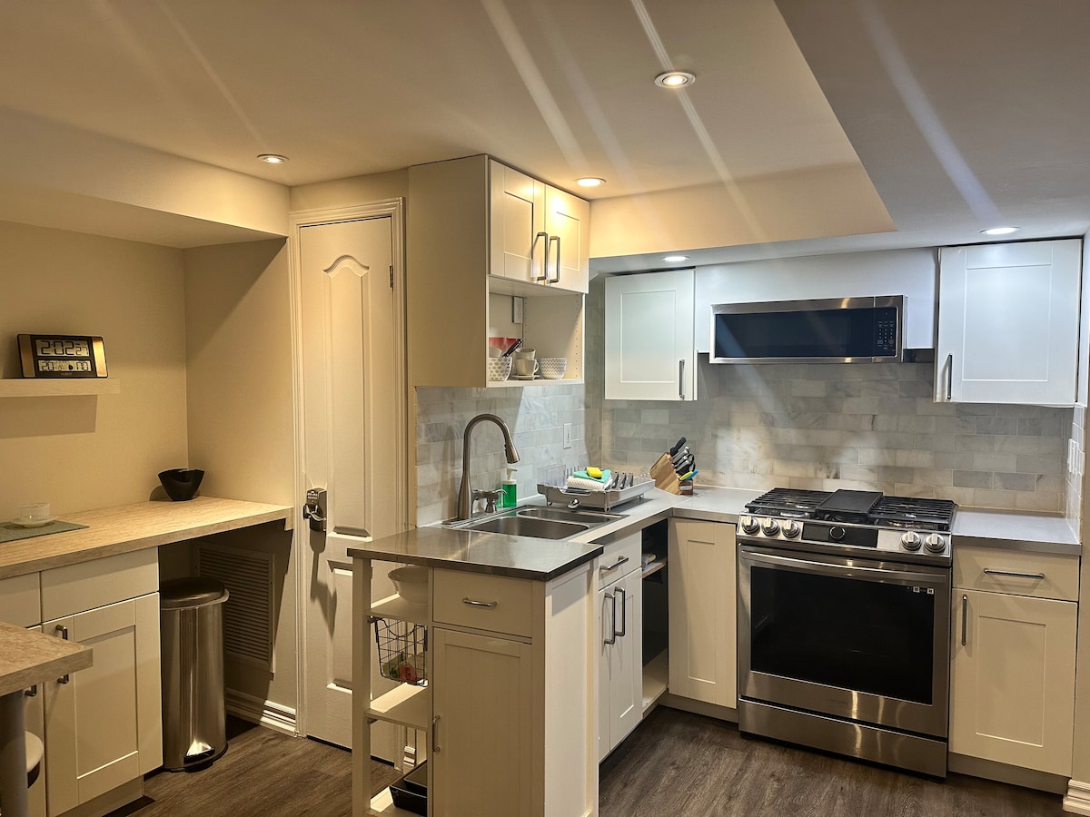 Todo el sótano Entrada aparte 8 ventanales grandes Techo de 9 pies 2 dormitorios 3 camas (2 camas tamaño queen + 1 sofá cama) 1 plaza de aparcamiento gratuita (el aparcamiento adicional está disponible por 10 $ por noche, que se puede pagar en la aplicación de Airbnb) Baño completo con toallas y secador de pelo. *** Lavadora y secadora en la suite (15 $ por carga)*** Cocina completa con utensilios de cocina. Lavaplatos Cocina con horno Microondas Hervidor, cafetera Keurig, tostadora Zona para trabajar con computadora portátil Limpieza profesional