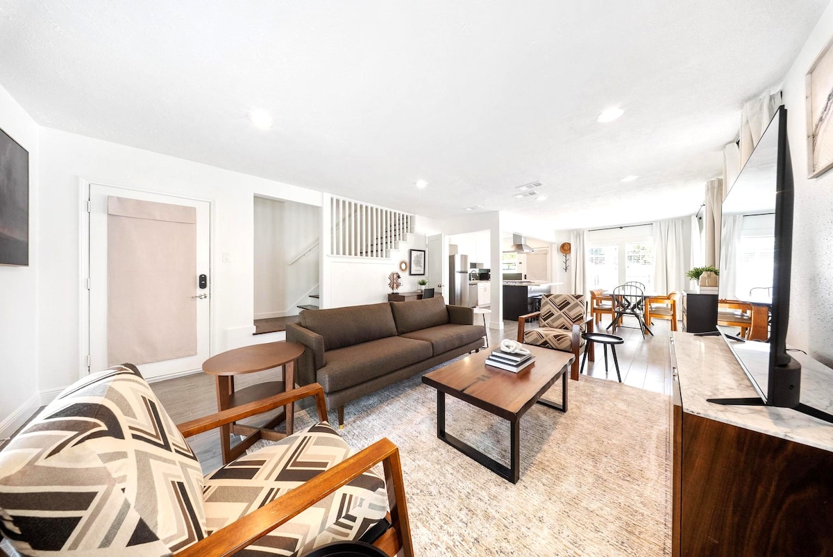 Descubre Houston en este dúplex elegante, con un interior chic monocromático y toques de arte colorido. Tu porche y un gazebo con BBQ en un jardín exuberante te esperan. A solo 5 minutos de Whole Foods y Buffalo Bayou, ubicado en el vibrante barrio de Lower Montrose. Con dos camas queen y un acogedor espacio vital, las atracciones de Houston están a tu alcance. Prepárate para una experiencia inolvidable. ¡Reserva ahora para tu escapada perfecta en Houston!