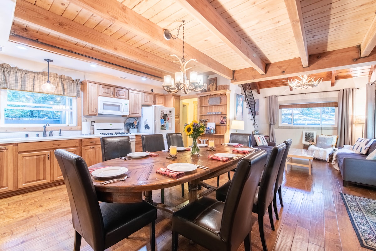 As you walk up stairs passing native boulders and trees, you see an A-frame cabin in the woods begin to peek out, inviting you. Once upon the front deck, the large pane windows draw you into this spacious, high-ceiling, open-concept cabin. Inside, these same windows that drew you in, will encourage the same gazing now, except outwardly. Tastefully designed and relaxing, you may not want to leave, though Big Bear, and Lake Arrowhead all beckon within 30 mins drive... Welcome to The Scandia 🦌