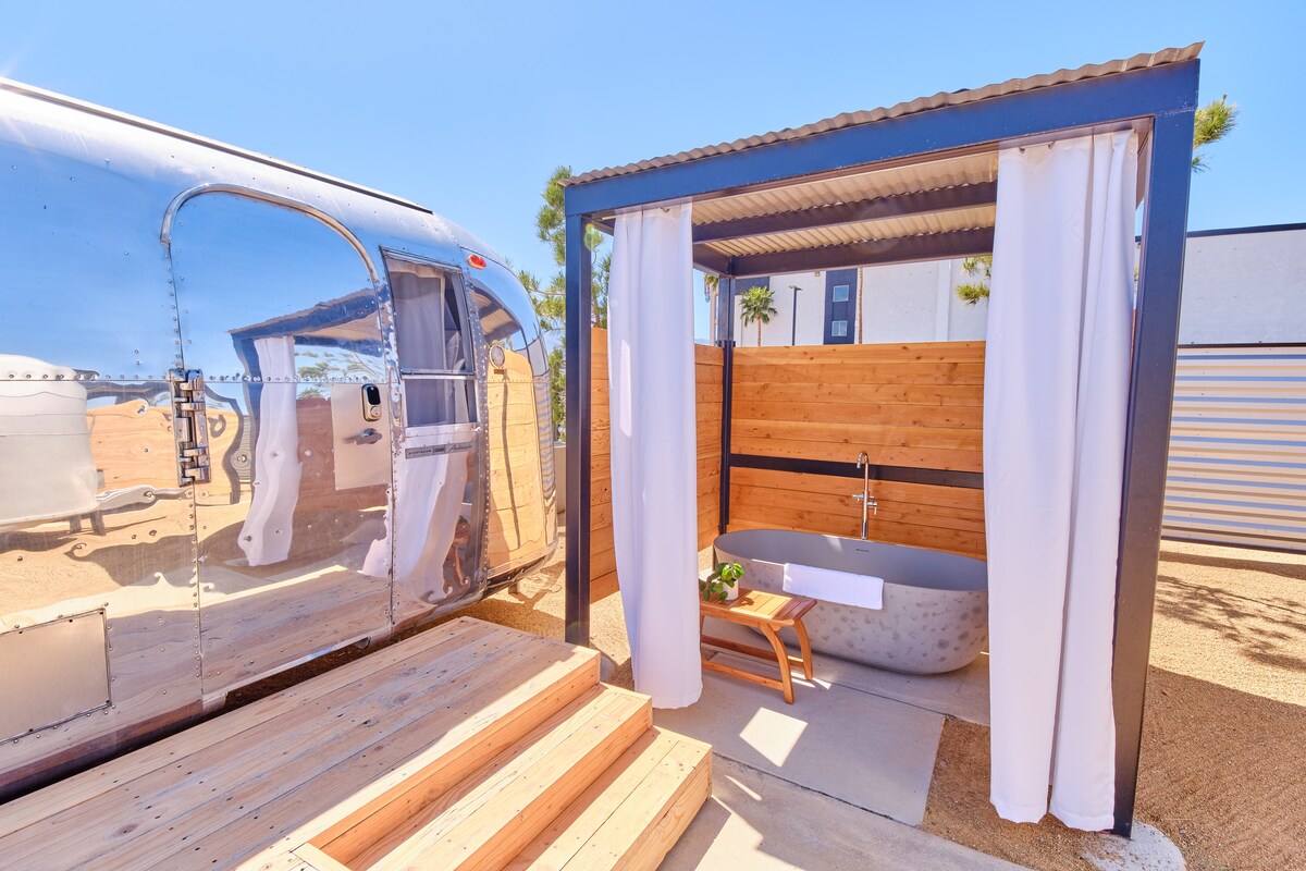 Conoce a Savine, un Avion de 1979 diseñado para escapadas íntimas, donde los blancos frescos, los suelos de madera de arena y los detalles en azul costero evocan la serenidad del desierto y Malibú. Es tu refugio privado con dos experiencias de inmersión: una bañera del tamaño de un spa en el interior y otra bajo las estrellas en su cubierta aislada. Escondido con vistas panorámicas a la montaña y a pasos de manantiales minerales, Savine crea momentos de paz y mimos.