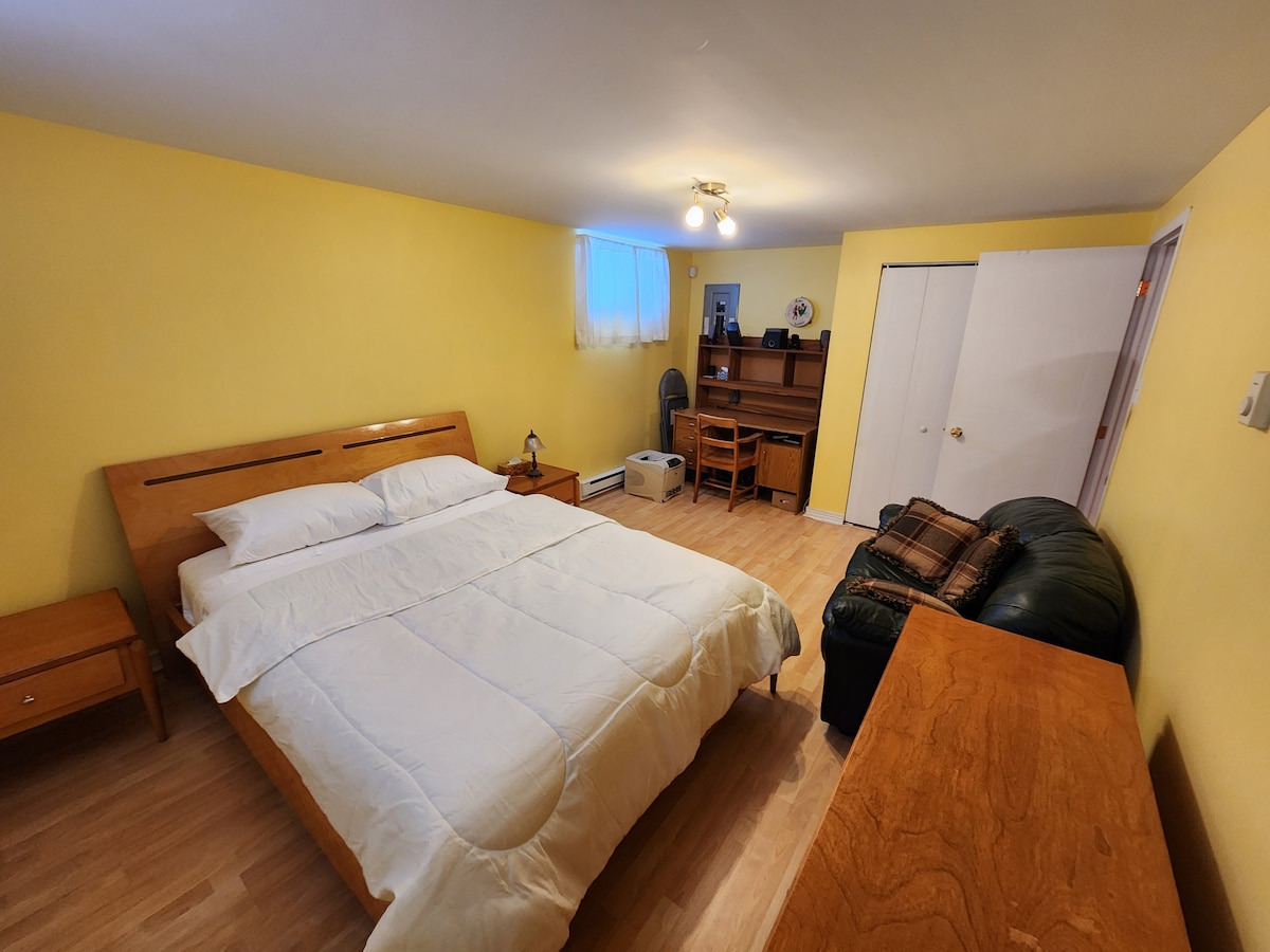 NO se permiten INVITADOS, debe estar solo en todo momento. NO SE PERMITEN INVITADOS, debe estar solo en todo momento. Este pequeño estudio muy limpio en el sótano de nuestra casa le acomodará. Acceso privado exterior y estacionamiento privado en el lateral de la casa. Fácil acceso cerca de las autopistas o a 2 minutos de una parada de autobús para el metro que lleva a Montreal. Aproximadamente 30-45 minutos en automóvil del centro de Montreal. Tiendas de comestibles y otros en