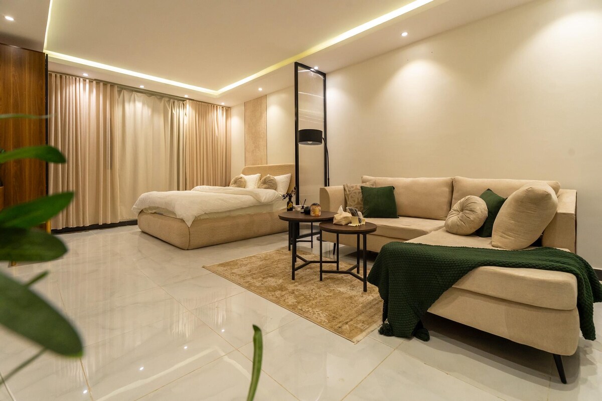 Acogedor y lujoso apartamento diseñado por el arquitecto Khaled, situado cerca de Boulevard y cerca del Centro Financiero (KAFD). Cuenta con una chimenea simulada que añade un ambiente cálido y acogedor. Incluye un dormitorio con una cómoda sala de estar, un elegante vestidor con un tocador de maquillaje de diseño único y un espacioso armario. El apartamento cuenta con un diseño sofisticado y cómodo, perfecto para la vida moderna.