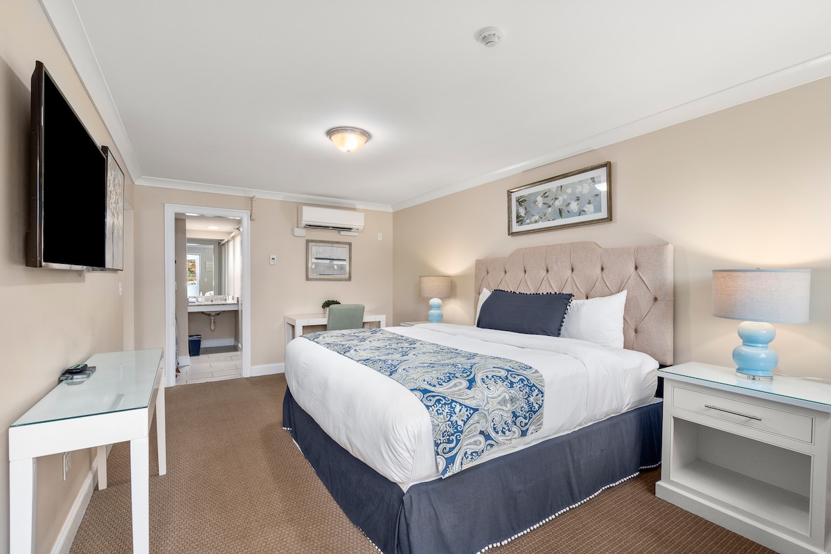 Ubicadas en las plantas 2.ª y 3.ª del Main Inn, las habitaciones del Country Inn son bastante pequeñas pero están elegantemente decoradas. Todas las habitaciones están decoradas individualmente con (1) cama queen, baños privados con ducha y servicios estándar. Estas habitaciones tienen pequeños baños y buhardillas sobre las camas/ventanas. Las habitaciones incluyen nuestro desayuno buffet y wifi. No hay vistas al mar, pero la playa está a pocos pasos. *No apto para cunas o cunas de viaje, máximo 2 huéspedes * **Ten en cuenta que NO hay ASCENSORES en ninguno de nuestros edificios.
