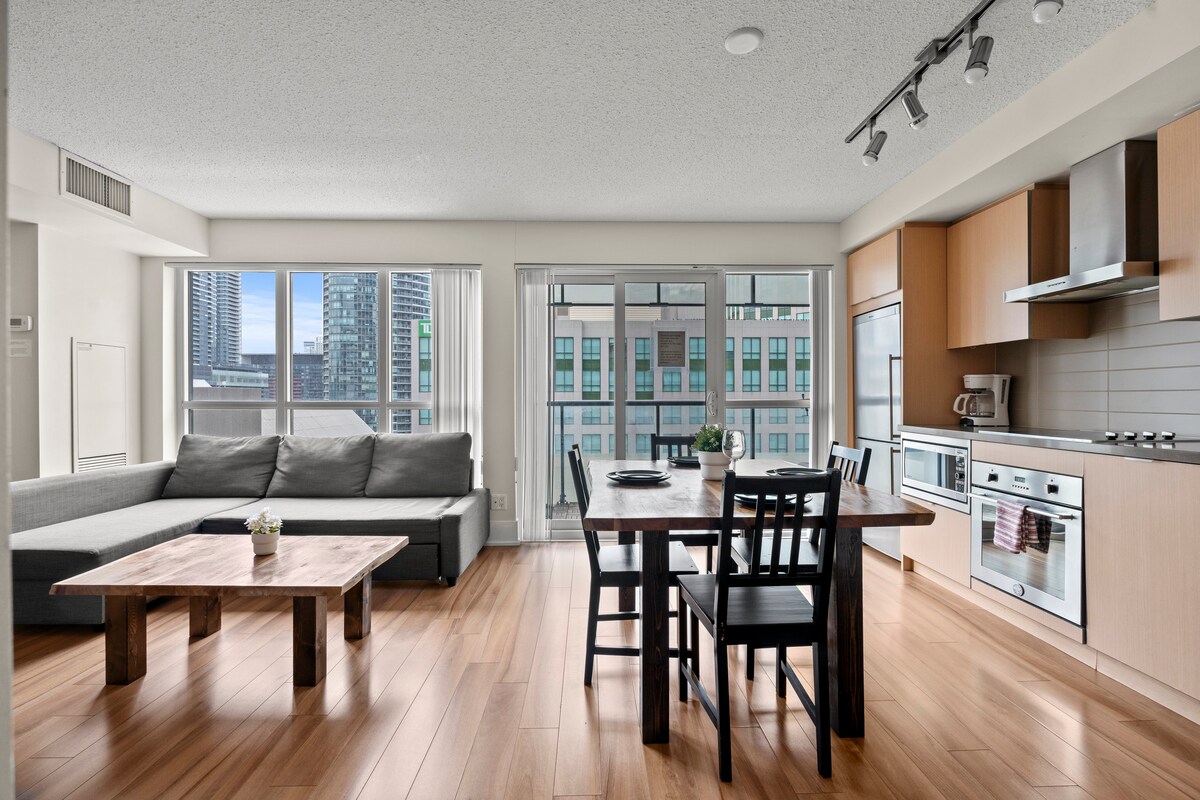 Disfruta de lo mejor de Toronto en nuestro moderno apartamento de un dormitorio más un sofá cama, idealmente ubicado en el vibrante corazón de la ciudad. Disfruta de impresionantes vistas desde un piso alto, ofreciendo un refugio perfecto para exploradores urbanos y viajeros de negocios. Con fácil acceso a las principales atracciones, incluida la icónica Torre CN, y excelentes opciones de transporte, nuestro apartamento combina comodidad con conveniencia, lo que lo convierte en la base ideal para descubrir el encanto y la energía de Toronto.