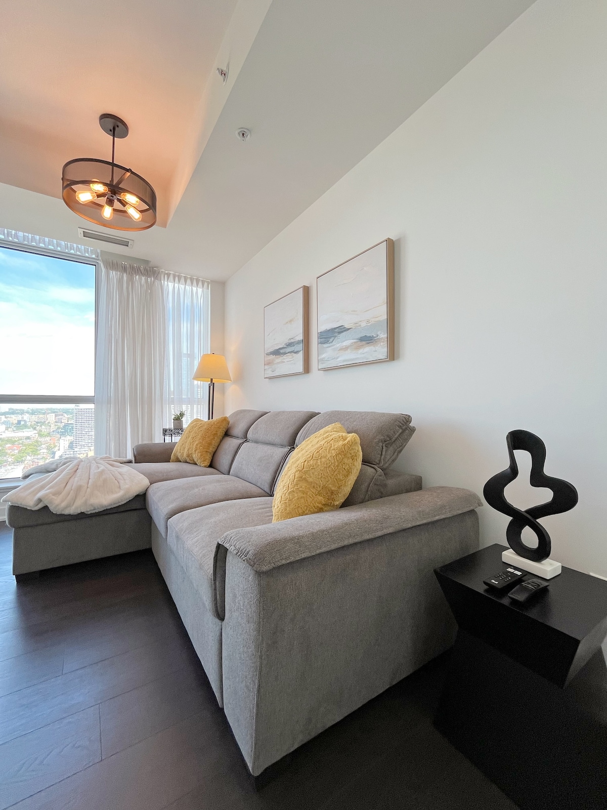 Disfruta de lo mejor de Toronto en nuestro moderno apartamento de un dormitorio más un sofá cama, idealmente ubicado en el vibrante corazón de la ciudad. Disfruta de impresionantes vistas desde un piso alto, ofreciendo un refugio perfecto para exploradores urbanos y viajeros de negocios. Con fácil acceso a las principales atracciones, incluida la icónica Torre CN, y excelentes opciones de transporte, nuestro apartamento combina comodidad con conveniencia, lo que lo convierte en la base ideal para descubrir el encanto y la energía de Toronto.