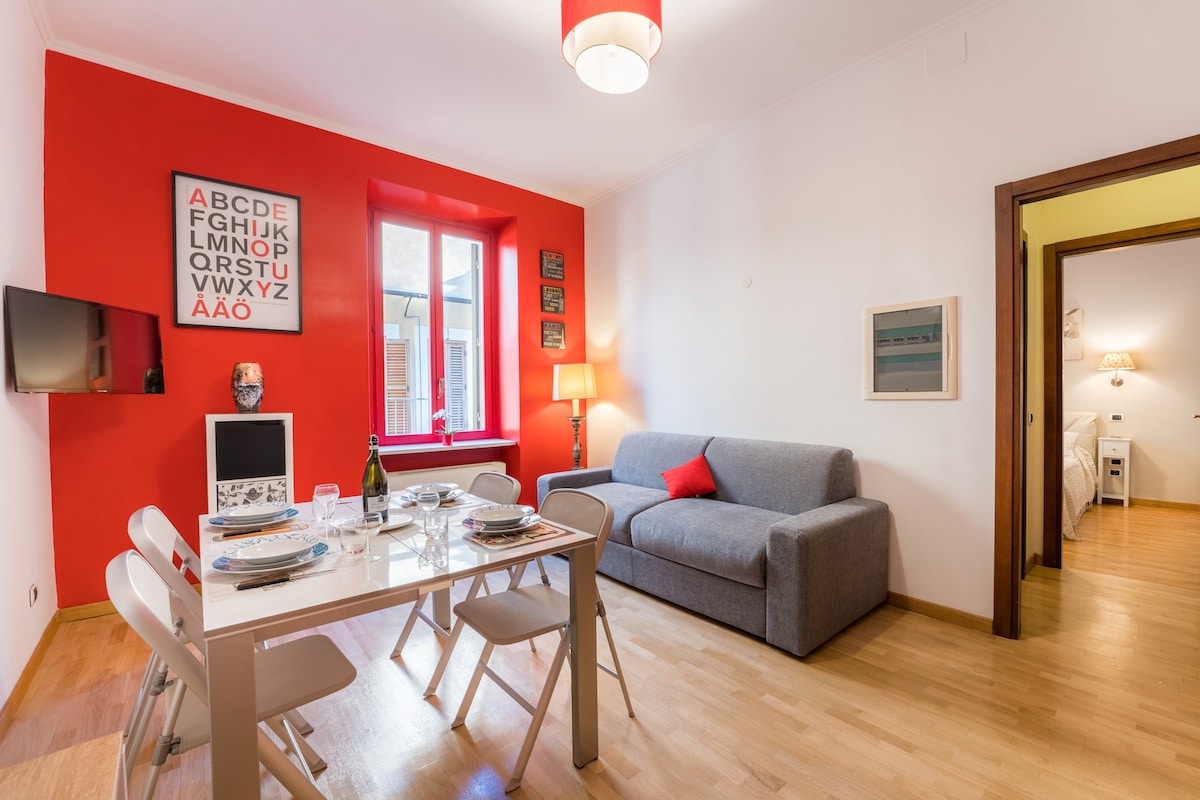Rivivi la storia della città eterna soggiornando in un antico palazzo del XVI secolo fatto costruire da un cardinale, a pochi passi dai Fori Imperiali. Las habitaciones son amplias, acogedoras, decoradas con buen gusto y muchas piezas de arte moderno y diseño. El ambiente cálido y casualmente elegante del apartamento se encuentra en una ubicación única frente a los Foros Imperiales y a dos minutos a pie del Coliseo, ¡es muy fácil llegar a todo!El apartamento se compone de dos amplias habitaciones, en la sala de estar hay un sofá cama tamaño queen, una mesa de comedor de los años 50 y una nueva cocina totalmente equipada. En el dormitorio hay una cama tamaño king con un armario doble y un escritorio cómodo. El baño está en el dormitorio, por lo que sería mucho más fácil para una pareja compartir el apartamento con un familiar que con un amigo. El apartamento está en el segundo piso sin ascensor. Te alojarás en un apartamento de dos habitaciones con baño y cocina americana. Siempre es un placer para mí conocer gente nueva, estaré disponible por mensaje siempre que mis huéspedes necesiten información o ayuda, estaré encantado de ayudarlos en sus paseos por mi ciudad. El apartamento está situado en el corazón del barrio de Monti, lugar de encuentro de los romanos con sus numerosos restaurantes, tiendas de moda y talleres de artesanía. Las calles y callejones son los de la antigua Suburra, donde vivía el pueblo de la antigua Roma. Dos paradas de metro están a pocos minutos a pie del apartamento: Cavour y Colosseo. Muchos autobuses que van en todas las direcciones de la ciudad se detienen en las dos calles principales más cercanas: Via dei Fori Imperiali y Via Cavour. ¡Via del Colosseo está realmente muy bien comunicada! Si llegas desde la estación de Termini, tomarás el metro B dirección Laurentina y bajarás en la parada Colosseo.