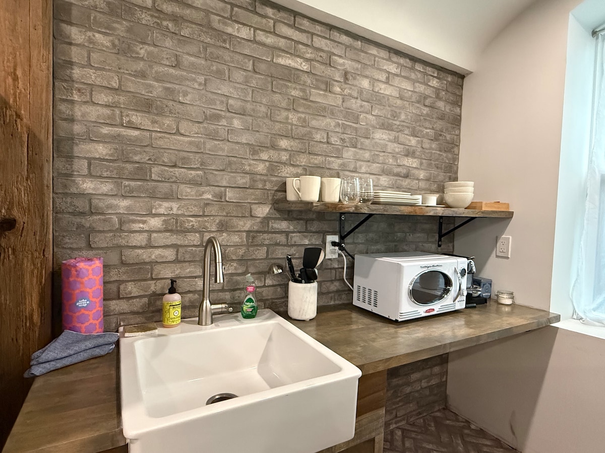 Escápate a la encantadora Kingston, Nueva York, y alójate en el apartamento con jardín de nuestra histórica casa de ladrillo construida en 1880. El estudio, similar a un útero, tiene suelos de arcilla calefactados y un dormitorio flotante que te envolverá y calmará. El patio trasero privado con paisajismo de piedra y chimenea es tuyo solo para disfrutar. Camina por el paseo marítimo hasta el distrito de Strand con tiendas, restaurantes y museos, o conduce hasta los pozos de natación circundantes y los senderos naturales de Woodstock, Rosendale, High Falls y Saugerties.
