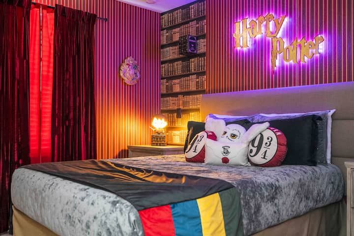 Arriba, encontrarás dormitorios bellamente temáticos que transforman tu estadía en una aventura mágica. La suite principal ofrece comodidad contemporánea, con una lujosa cama tamaño king, una decoración relajante y un baño privado con ducha de vidrio. El dormitorio de Harry Potter deleita a los huéspedes de todas las edades con una acogedora cama tamaño queen, una decoración caprichosa e iluminación ambiental que recuerda al propio Hogwarts. Igualmente encantador es el dormitorio con temática de Disney, adornado con vibrantes murales con Mickey y Minnie y que ofrece dos cómodas camas individuales, perfectas para que los niños sueñen bajo las estrellas de Disney. El alojamiento también ofrece comodidades convenientes, incluidas las instalaciones de lavandería en la unidad, lo que garantiza que puedas empacar más ligero y viajar más fácilmente.