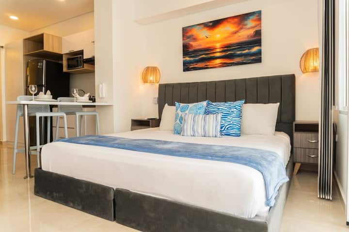 Hermoso estudio con vista a la piscina, cama king muy cómoda, sofá cama ideal para familias pequeñas y espacio de trabajo. Cocina equipada, baño moderno. El edificio ofrece gran piscina, jacuzzi, piscina infantil, sauna, turco y zona de descanso con mobiliario luxury. A solo 2 min del aeropuerto y a 3 min caminando de la playa. Perfecto para viajes de trabajo o descanso en pareja. ¡Te encantará Cartagena!