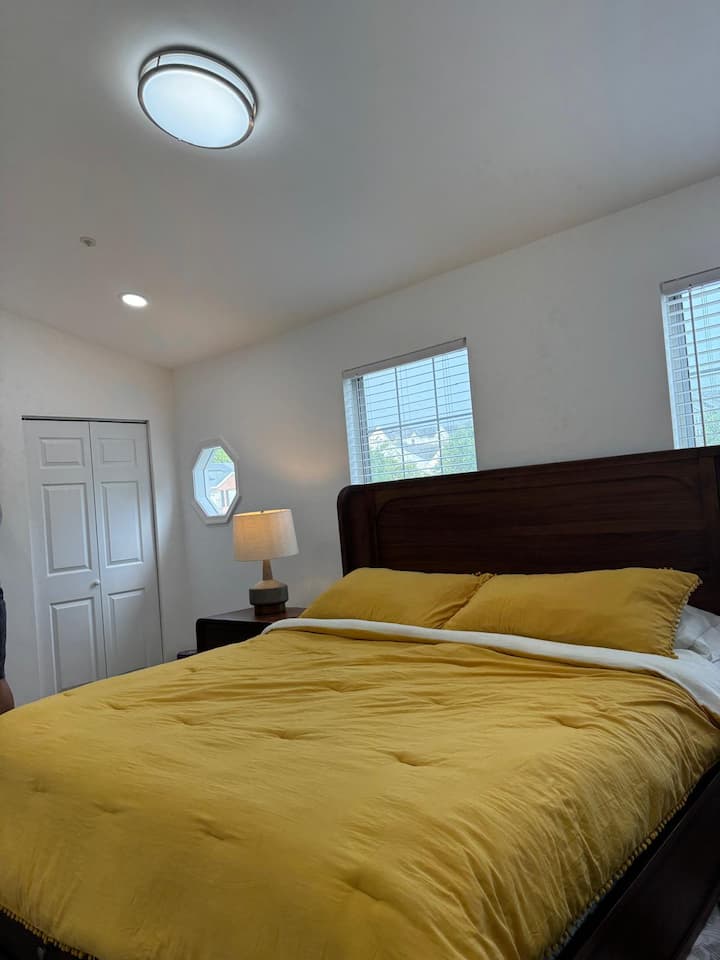 Habitación principal con cama tamaño king en casa reformada