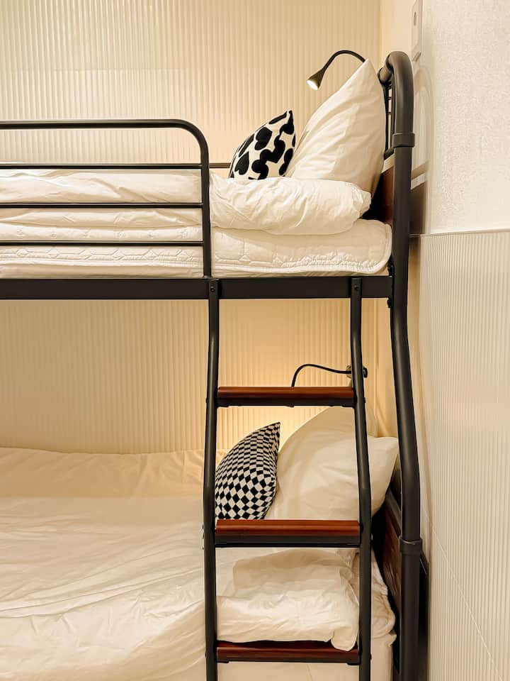 ⭕ Espacio: aproximadamente 10 pyeong (33 ㎡) de espacio con 2 habitaciones, 1 cama tamaño queen (2 personas), 1 litera (2 personas), cocina, sala de estar y 1 baño para 4 personas.