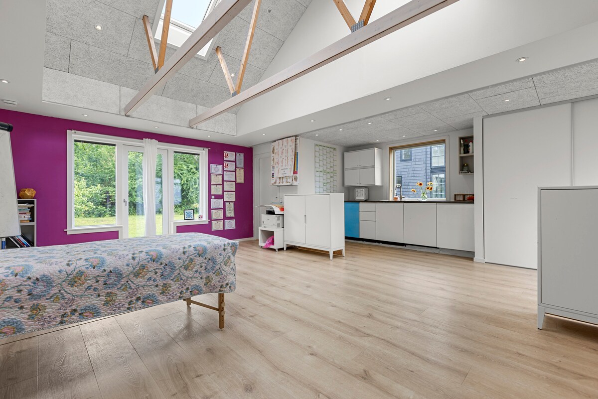 Dette unikke gæstehus er en perle, der ligger super roligt omgivet af natur, 100m fra bådhavn, 400m til stranden. Gæstehuset er et stort Studio, med højt til loftet ovenlysvinduer, lækkert større thekøkken med køleskab og opvaskemaskine. Dobbeltseng og skrivebord - unik arbejdsbolig til alle der ønsker ro og fred og fokus. Her Nyder Du dig selv, men kun ganske kort til Jyllingecenter 4 KM - og 400meter til Grillen og 1,9KM til nærmeste indkøb. KUN 35min. fra København City.