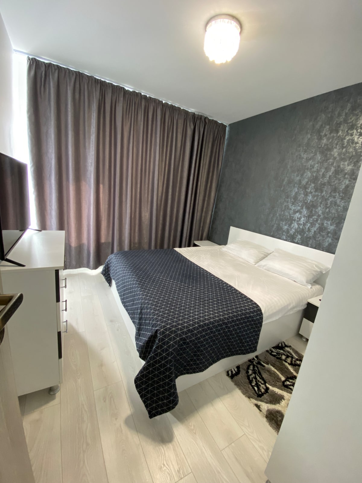 Disfruta de una experiencia elegante en este alojamiento céntrico en Militari Residence. Este apartamento tiene lo siguiente: Aparcamiento privado con barrera Paredes decoradas con Stucco Veneziano Televisión inteligente 4K con Netflix Aire acondicionado El complejo tiene: piscina interior y exterior, sauna húmeda y seca, jacuzzi, gimnasio. La distancia a Welness es de 500 metros, y a Aqua Garden a 550 m, a unos 7 minutos a pie. El precio de acceso a la piscina es de 75 Ron/ persona