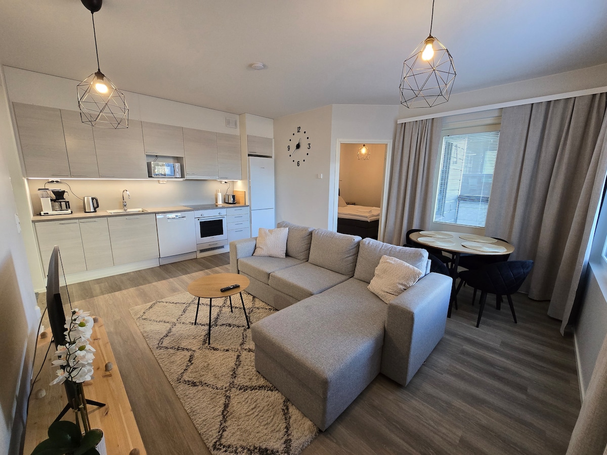 Winter Dream Suite – Luxury and Relaxation Near the City Center This high-quality and spotless apartment accommodates up to four guests and features a private sauna and a cozy balcony. The location is perfect: a peaceful setting ensures restful nights, yet the city center with its services and attractions is just a short walk away. Scandinavian style 2nd floor apartment has a large living room, alcove with queen size bed, sauna and furnished balcony. Fully equipped kitchen.