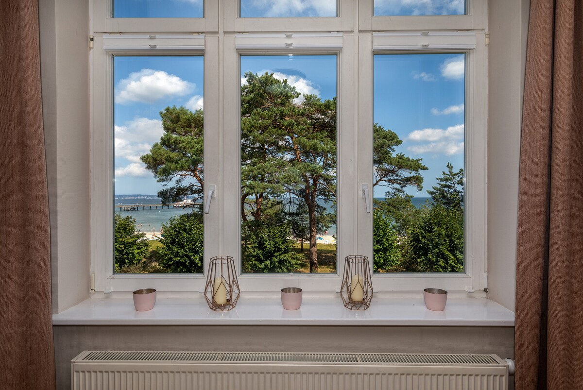 El apartamento de 51 metros cuadrados frente a la playa "Mar Báltico" está en una villa construida alrededor de 1905 en la hermosa Wilhelmstraße en Sellin. Se caracteriza por la arquitectura clásica del spa y corre directamente al famoso muelle y a la playa principal de arena fina. La segunda playa sur de un kilómetro de largo también está a la vuelta de la esquina. El departamento tiene capacidad para 4 personas y tiene un fantástico invernadero con sol por la tarde y por la noche.