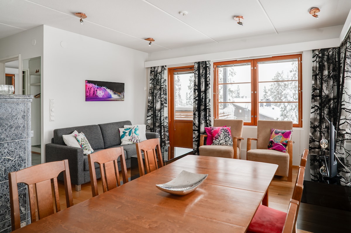 Karhunpesä es un acogedor departamento con acceso directo a las pistas de esquí en el corazón del pueblo de Ruka, que ofrece un punto de partida ideal para unas vacaciones activas en la Laponia finlandesa. Acceda directamente a las pistas, disfrute del esquí de fondo y llegue a restaurantes, tiendas y servicios en un radio de 200 metros. Este departamento de 46 m² con sauna privada puede alojar cómodamente hasta cuatro huéspedes y ofrece vistas panorámicas a Riisitunturi. En las noches despejadas, es posible que incluso pueda contemplar hermosas puestas de sol o la aurora boreal. Wifi gratuito incluido.