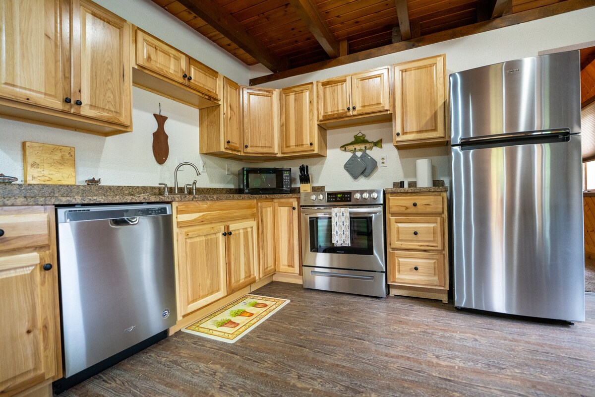 Esta increíble casa de madera cuenta con un lujoso dormitorio principal con una cama tamaño king y un baño privado en el loft. El área de abajo incluye tres camas tamaño queen y un cómodo medio baño con lavadora y secadora. El piso principal cuenta con una cocina totalmente equipada, un baño y una acogedora sala de estar. Los seis taburetes de bar alrededor de la barra de la cocina y la mesa de comedor para seis personas ofrecen un amplio espacio para el entretenimiento de hasta doce huéspedes.