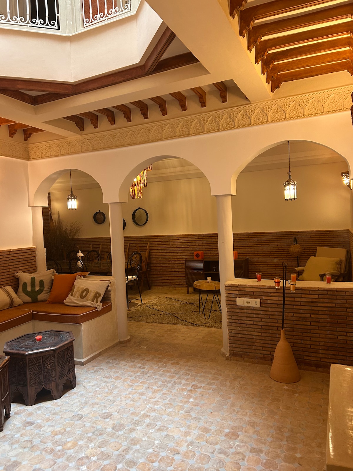 Notre Riad est une promesse d'évasion. Imaginez vos matinées bercées par le chant des oiseaux dans le patio et vos soirées sur la terrasse surplombant la ville rouge. Un mélange raffiné de zelliges traditionnels et de confort contemporain. Un salon de lecture pour s'évader, des chambres élégantes pour se ressourcer. Un patio rafraîchissant, pour le café du matin et un rooftop pour savourer le coucher du soleil. Hospitalité marocaine et confort absolu : votre parenthèse enchantée commence ici.