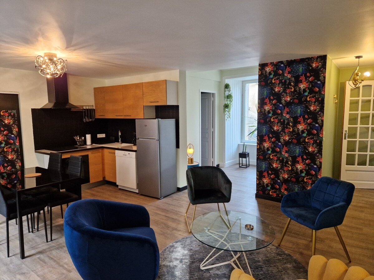 NOVEDAD: LoveRoom L’Antre d 'Eux, casa de 80 m2 - a 5 minutos de Issoire Compuesta por: -Cocina totalmente equipada -Habitación romántica mimos cama 160x200 - Cuarto de SPA bañera Balneo, ducha a ras de suelo, sauna -WC -Sala de cine con sofá cama -Corte interior ¡Café, té, ofrecidos en el lugar! Plaza de estacionamiento privada, barrio tranquilo Restaurantes cercanos Llegada a las 17:00 salida al día siguiente 11:00 Caja de llaves Limpieza a nuestra cargo