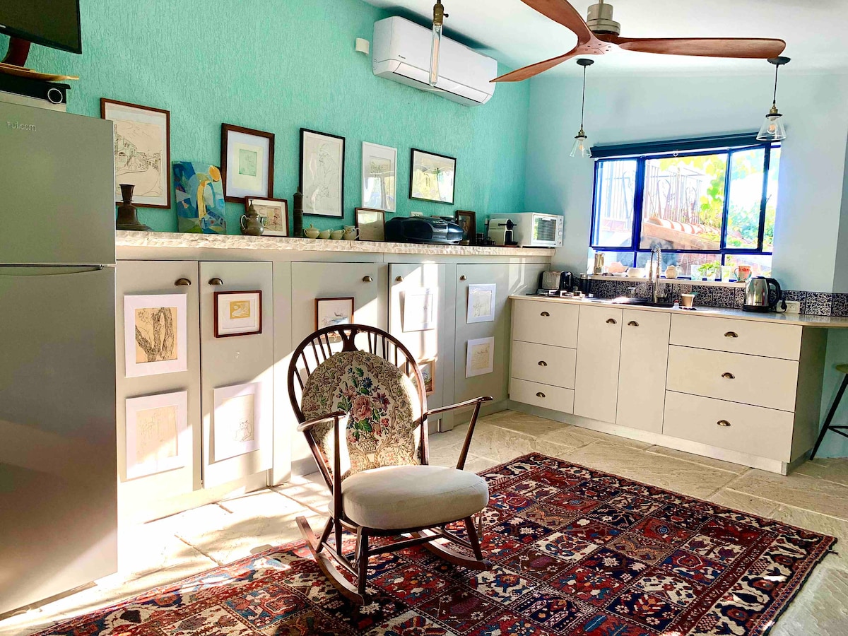 ¡Un B&B de 17 metros que lo tiene todo ! La cocina incluye platos, nevera , cafetera Nespresso, olla, ducha , etc. Los entusiastas del cine tienen un proyector + sistema de sonido + appleTV que incluye Netflix , TV Cellcom para el programa . Cama Hollandia súper cómoda que se pliega en un sofá durante el 140 de hoy/190. Los higueras rodean el bed and breakfast y dan una atmósfera mágica. Adecuado para una pareja que busca paz durante el fin de semana y, en general, todos son bienvenidos (-: Llega sin una reunión y disfruta del 100% de privacidad (check-in autónomo) con previo aviso