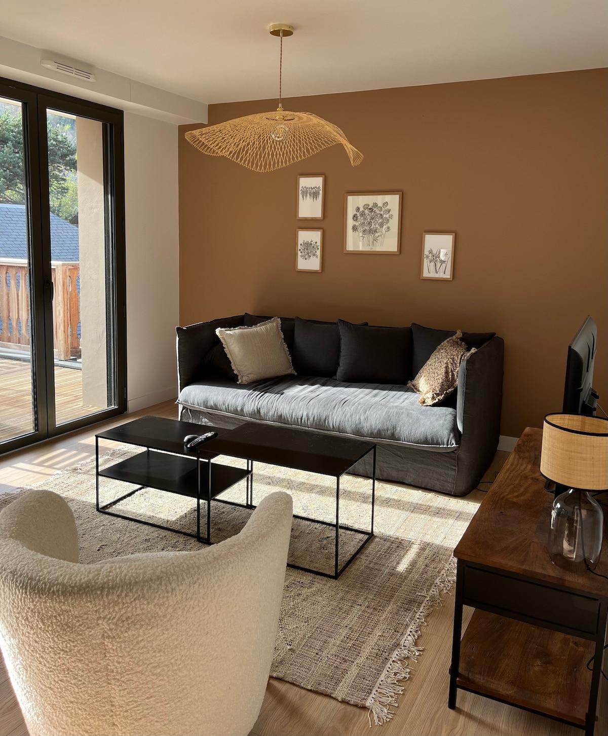 Apartamento 100 % acogedor, situado en la segunda planta de un pequeño edificio. Ubicación tranquila, pero situado en el corazón del pueblo, con un amplio aparcamiento no privado. Un nido acogedor de 35 m2 para 4 personas, cálido y refinado. 100 m2 de terraza y jardín privado. Para dormir: 1 dormitorio con una cama de 140x190 y un gran vestidor, sofá cama con un colchón real de 140x190 Camas hechas a la llegada. Cocina totalmente equipada. Cuarto de baño con ducha, aseo independiente. Toallas de baño incluidas.