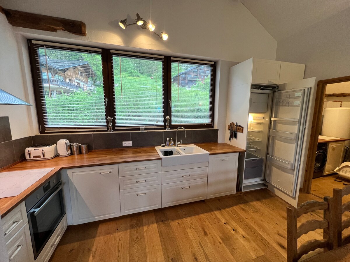 Top floor apartment with large balcony & stunning views! Central yet secluded location. - Master bedroom; super-king bed, Smart TV. - En-suite; corner shower & double ended bath. - Open plan living; inc. 55" smart TV (UK Freesat). - Large sunny balcony overlooking river with panoramic mountain views. - Underfloor heating - Secure storage for skis or bikes - Warm boot store/utility room Everything done to the highest quality to ensure a luxurious stay!