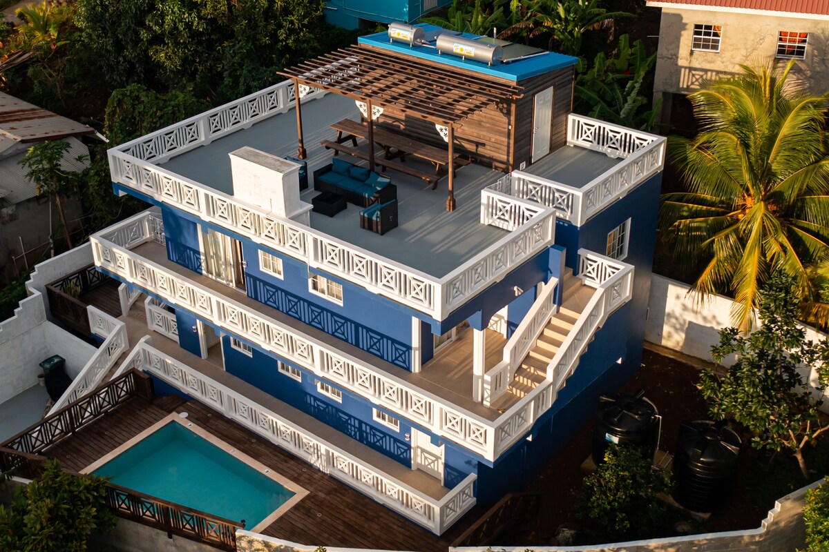 Nuestra propiedad de nueva construcción se encuentra muy por encima de las copas de los árboles en un pintoresco pueblo entre los lugareños. Este concepto abierto de 2 dormitorios y 2 baños ofrece acceso inmediato a una piscina, balcones para disfrutar de la fresca brisa marina y una terraza en la azotea con asientos al aire libre, chimenea y TV con vistas al exuberante follaje tropical hasta el océano. Estamos ubicados a solo 10 minutos del Aeropuerto Internacional de Hewanorra (UVF) y a poca distancia en coche de playas, restaurantes y las principales atracciones de la parte sur de Santa Lucía.