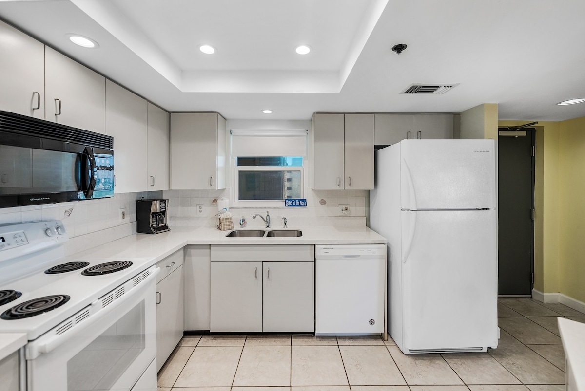 Nuestro apartamento tiene espectaculares vistas al agua desde la bahía hasta la playa. Tenemos una cocina grande y única en nuestro centro vacacional, con encimeras de granito, armarios de madera y todos los electrodomésticos de acero inoxidable. Se proporciona todo lo necesario para preparar una comida junto con especias y condimentos básicos, café, crema y azúcar. El dormitorio principal tiene una nueva cama tamaño king y un vestidor con todo el equipo de playa también disponible para tu uso. También tenemos 2 televisores de pantalla plana de 50 pulgadas con cable.