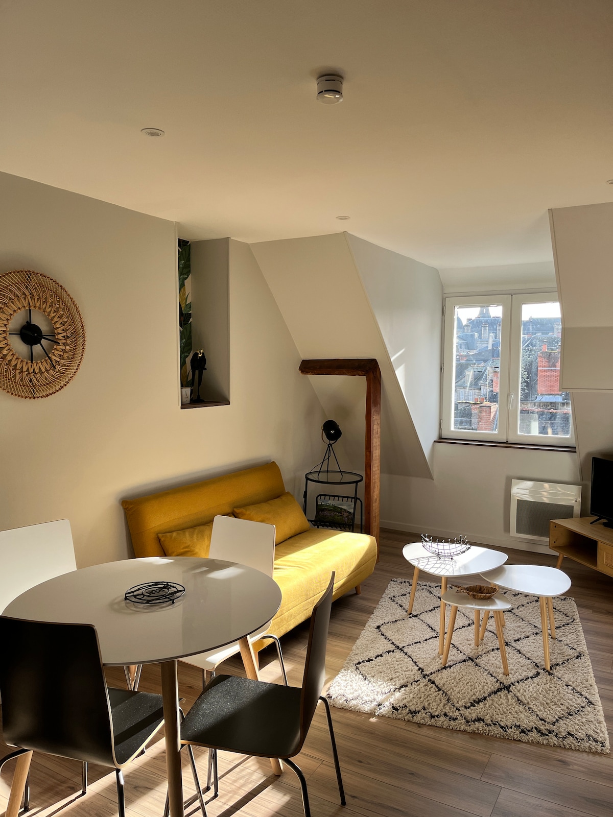 Disfruta de un alojamiento elegante y céntrico con este apartamento dúplex de estilo “Loft” totalmente renovado de 40 m². Encantador y luminoso, está en el tercer y último piso de un pequeño edificio orientado al sur y te ofrece una vista panorámica de los tejados de la ciudad de Gaillarde y la iglesia colegiata. Allí encontrarás una cocina equipada, dormitorio, baño, sala de estar con segunda cama doble y un espacio de oficina. La Place de la Guierle y su famoso mercado cubierto están a 200 m y la estación de tren a 10 minutos a pie.