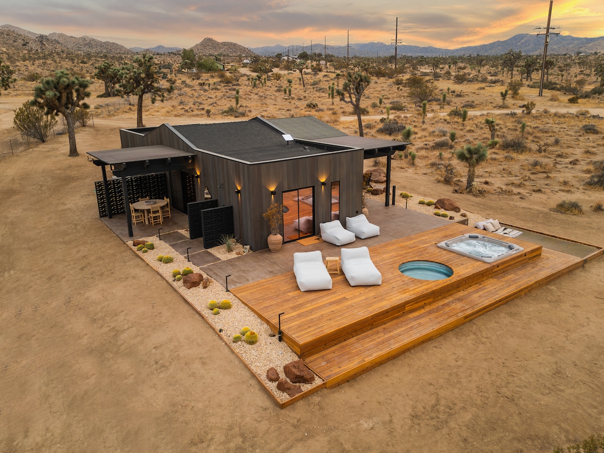 Welcome to Shadow House, located within the serene Solace Retreat - a private 10-acre sanctuary in Joshua Tree. Surrounded by sweeping desert views, Shadow House invites you to embrace outdoor living at its finest. Enjoy peaceful mornings on the deck, afternoons lounging by the built-in hot tub or cowboy tub soaking pool, and evenings by the fire pit under a starlit sky. Whether you seek reflection, connection, or simply the calm of nature, Shadow House offers a truly transformative experience.