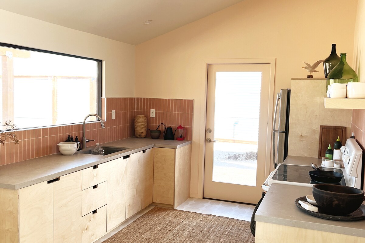 Retiro elegante y lleno de arte con aire acondicionado helado, bañera con patas, camas acogedoras, ducha al aire libre, TV gigante y muebles completamente nuevos. Ubicado en el Lower East Side de Bombay Beach, el barrio más cool de la ciudad, justo al lado del Museo de Arquitectura No Deseada y a pocos pasos de The Poetry House, Zigzag House y el Instituto de Espionaje Industrial y Estudios Post-Apocalípticos de Bombay Beach. Lo mejor de Bombay Beach, destilado.