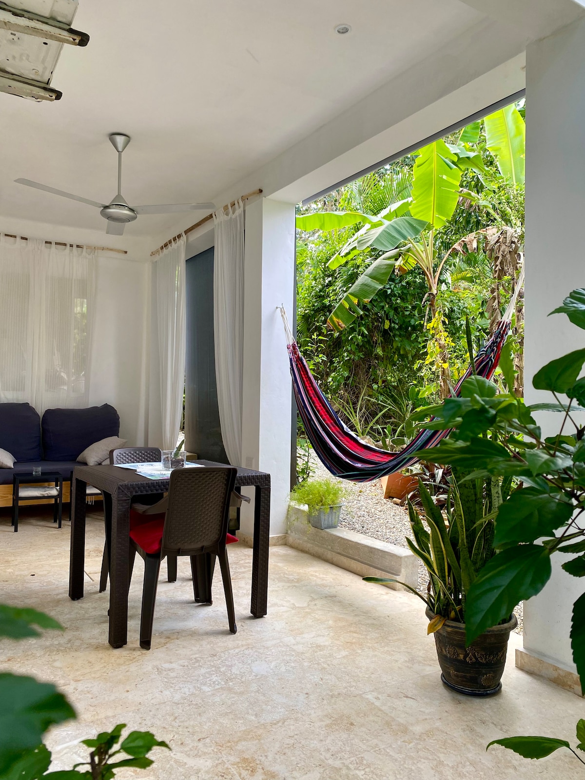 Independent bungalow/apartment full amenities in the Villa Serenidad’s tropical garden with private terrace, fast Starlink Wi-Fi and quiet area 5 min from Punta Popy Beach and center of the town. • 1 double bedroom • A/C & fan • Equipped kitchen • Private bathroom with hot shower • Private covered terrace with hammock • TV with Netflix included • Shared pool • Free private parking Ideal for couples, solo travelers or digital nomads seeking relax and privacy in nature.
