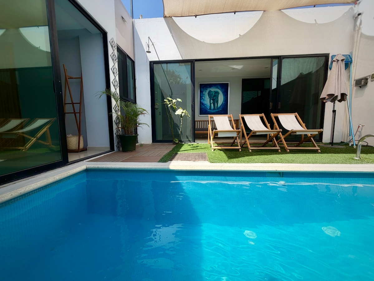 Bungalow privado y tranquilo creado en el 2019 al interior de nuestro jardín, en el corazón de la zona comercial de la ciudad. Con baño privado. Zona comercial y segura. No tiene estacionamiento, pero puedes estacionar sin problema en la calle. Entrada y llegada automática. En casa vive “Lu” (Australian shepherd) PUNTOS CERCANOS • Mercado local • Farmacia / súper 24 horas • Bancos ATM • Restaurantes, Cafés y Bares • Estación de autobuses ADO El centro de la ciudad está a 1km de distancia.